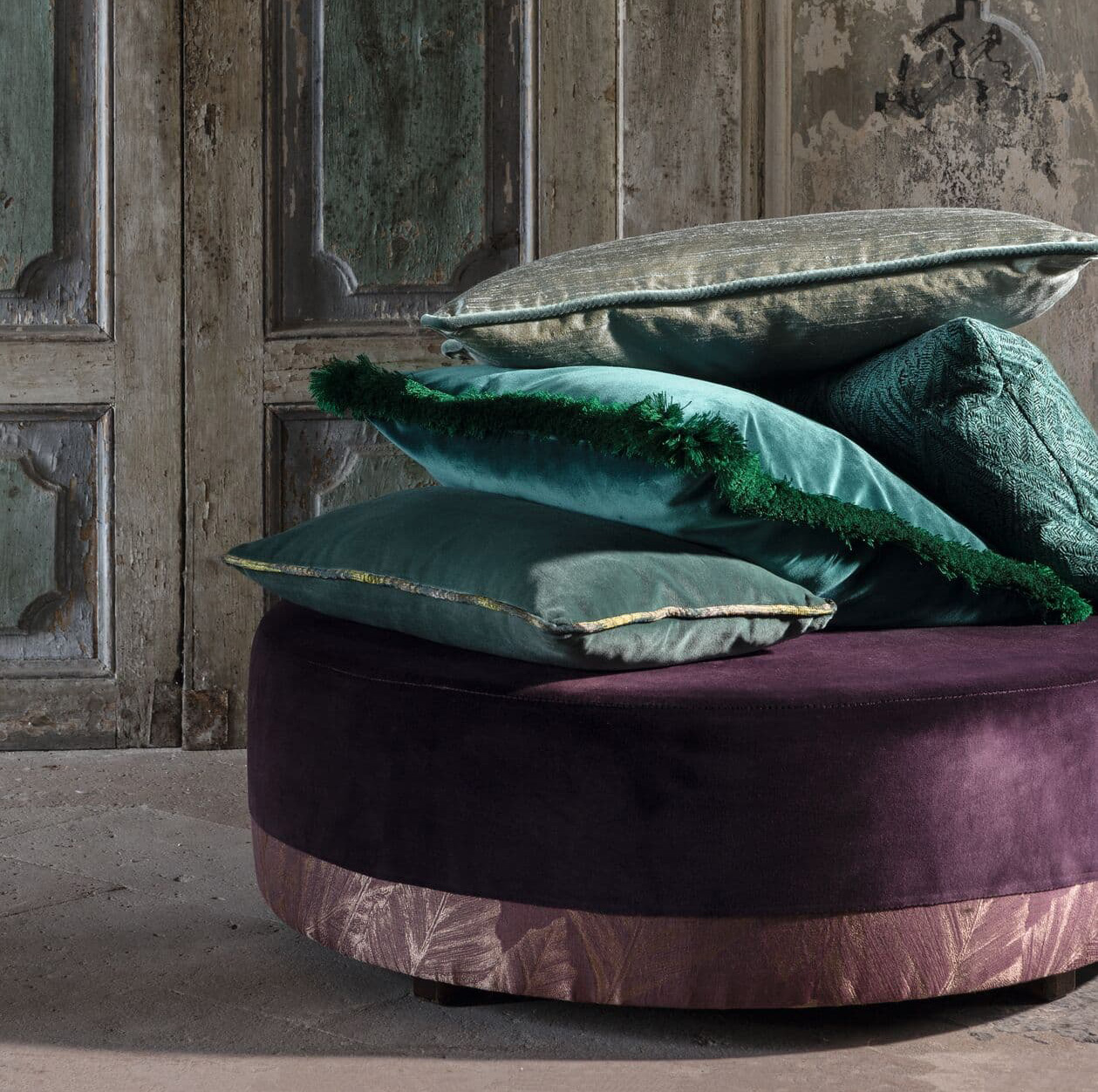 Patinirane površine s oksidiranim učinkom nadopunjene su blistavim materijalima koji se razlikuju po svojoj alkemističnoj iridescenciji. Ekstrovertni barsun, s dizajnom koji kao da potječe iz galerije suvremene umjetnosti, nalazi svoj savršen pandan u nježnoj vuni koja izgleda ručno tkana.